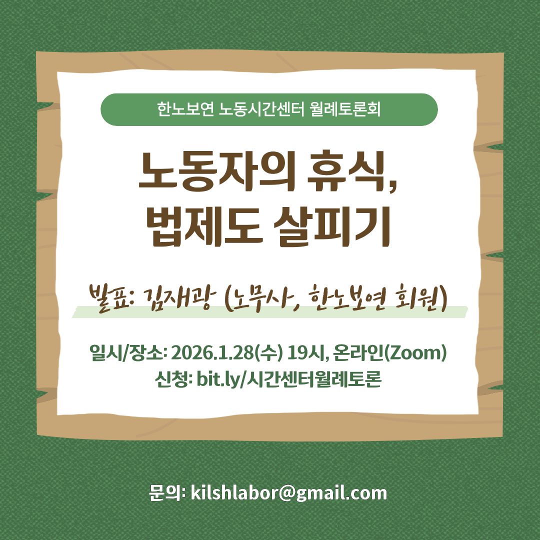 적정 휴식시간 보장은 노동자들의 건강에 매우 중요하지만 갈수록 심해지는 불규칙 노동 속 ‘휴식’을 어떻게 확보할 것인가? 이번 월례토론회에서 함께 나눠볼 예정입니다.