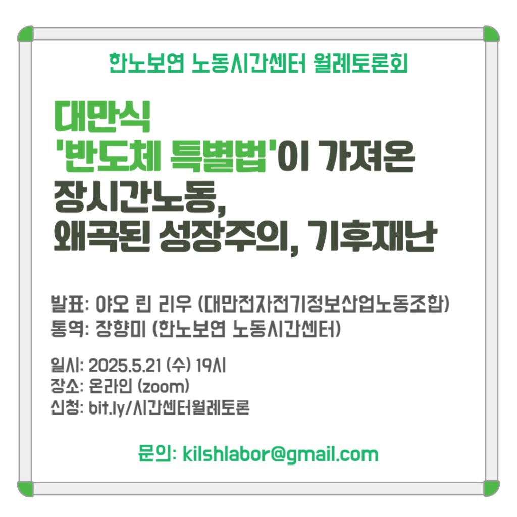 이번 5월 월례토론회에서는 대만전자전기정보산업노동조합의 야오 린 리우 사무총장을 초대해 온라인으로 발표를 들어볼 예정입니다. 공통의 문제를 안고있는 대만과 우리 노동운동, 앞으로의 대응방안을 함께 모색해보는 시간을 갖겠습니다.