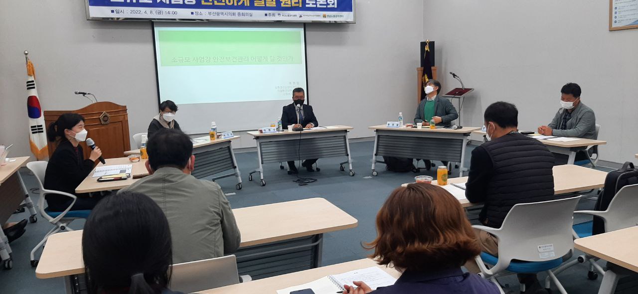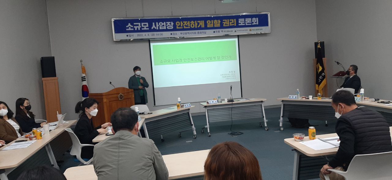 4월 8일(금) 14시, 부산광역시의회에서 부산노동권익센터, 울산북구비정규직노동자지원센터, 전남노동권익센터가 공동 주최한 ‘소규모 사업장 안전하게 일할 권리 토론회’에 류현철 소장 동지가 소규모 사업장 안전보건관리방향에 대해 발제하였고, 회원이신 성지민 동지가 토론자로 참여하여 소규모 사업장 안전보건관리 실태에 대한 고민을 공유하였습니다. |