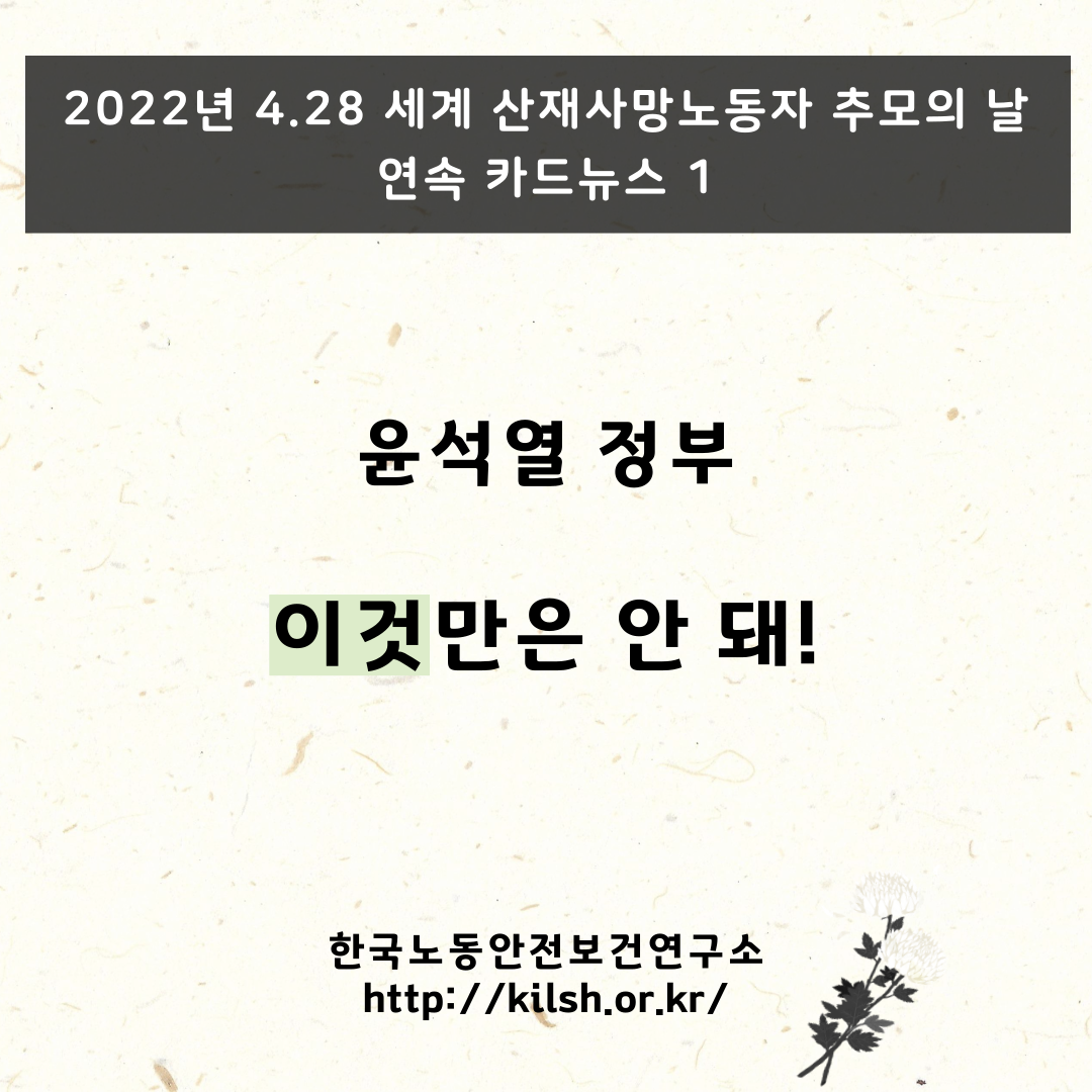 4월 28일은 ‘세계산재사망노동자 추모의 날’입니다. 노동자 건강권 쟁취의 달을 맞이하여 노동안전보건 개악을 추진하는 윤석열 정부를 향해 노동자의 건강하게 일할 권리를 위한 ‘융석열 정부 이 것만은 안 돼!’ 연속 카드뉴스를 기획했습니다. 함께 보러 가시죠!