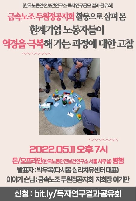 2020년 한노보연 독자연구공모 사업에서 선정되어 진행 된 이번 연구는, 두원정공지회가 한계기업 조건을 극복하고자 노력해오는 과정과 그 과정에서 조합원들이 경험한 바들, 그리고 그 속에서 조합원들이 느끼고 생각한 것들을 정리해냈습니다. 그리고 이번에 그 연구결과를 공유하는 자리를 마련하고자 합니다.