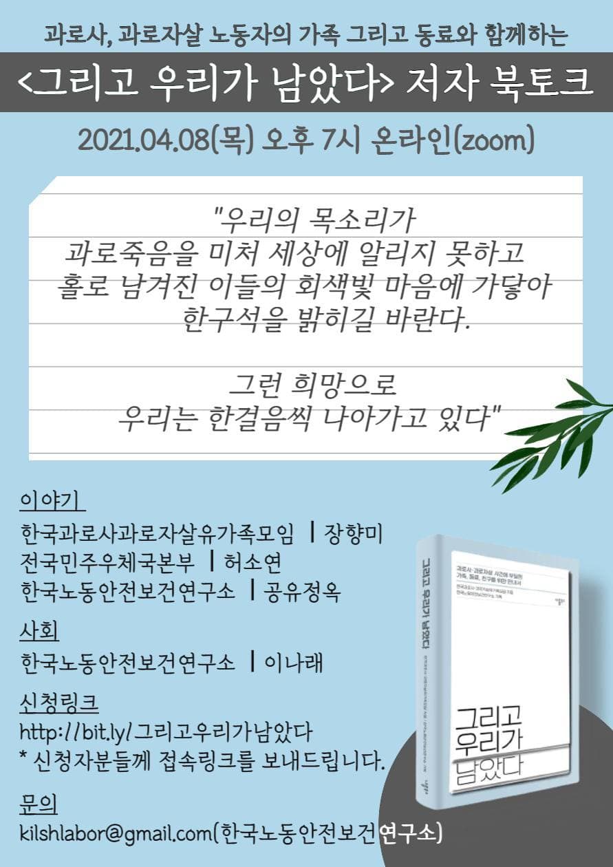 과로사 과로자살 사건에 부딪힌 가족, 동료, 친구를 위한 안내서 <그리고 우리가 남았다>가 출간되었습니다. 연구소가 기획하고 한국과로사 • 과로자살유가족 모임에서 작성한 소중한 책입니다. 아래 인터넷 서점과 동네 서점에서 구입해주시고 동네 및 학교 도서관에도 신청해주세요! |
