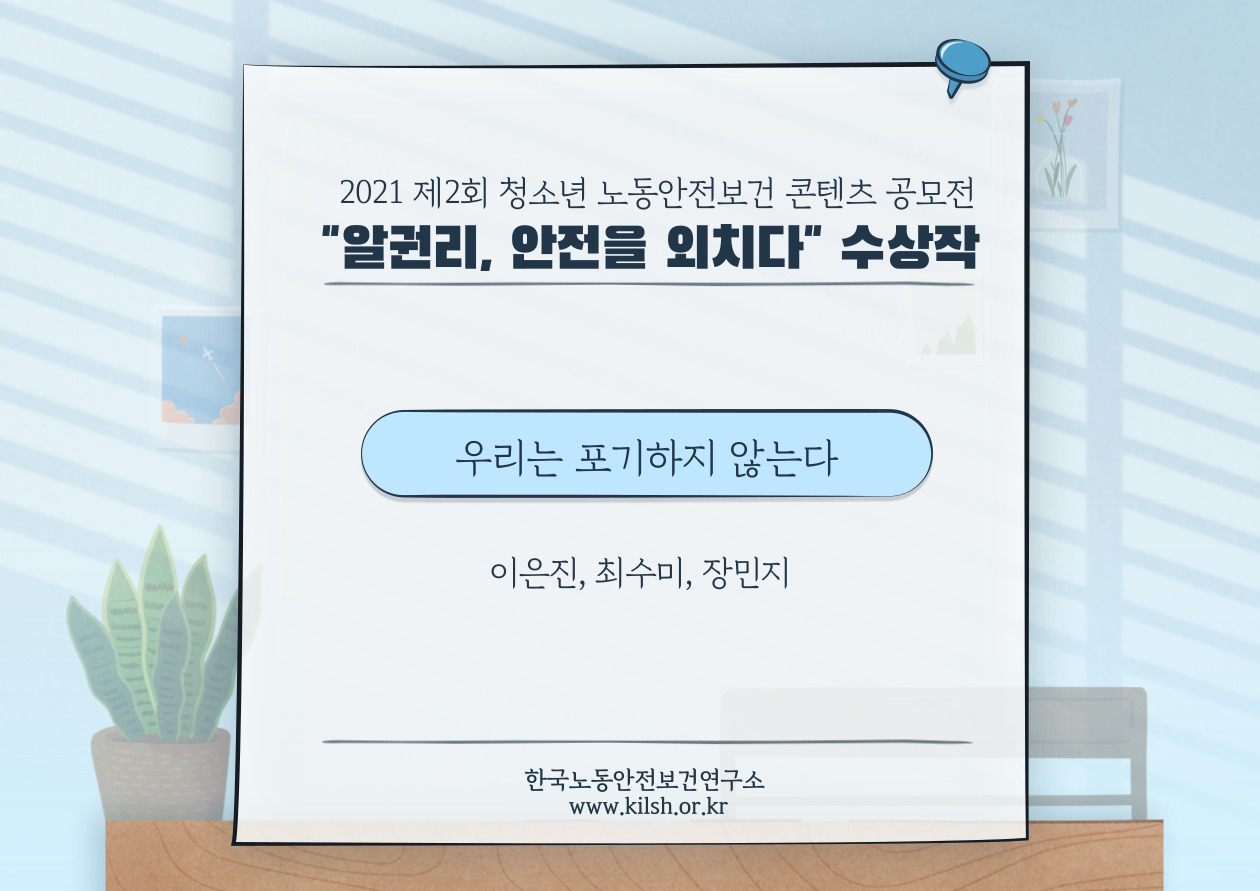 [한국노동안전보건연구소 청소년 공모전] 2021년 제2회 청소년 노동안전보건 컨텐츠 공모전 “청소년 노동자의 건강권 ‘알권리‘를 통해 묻고 답하다” 결과입니다. 공모작들은 영상/영화, 카드뉴스/웹포스터, 에세이/소설 총 세 부문으로 나누어 심사를 통해 선정됐습니다. 수상작은 아래 링크를 통해 확인하실 수 있습니다. |