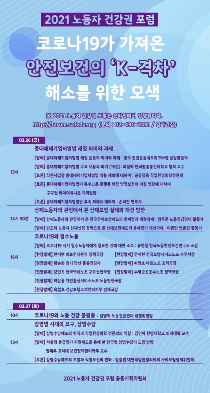 <2021 노동자 건강권 포럼> 안전보건의 ‘K-격차‘ 해소를 위한 모색이라는 주제로 <2021 노동자 건강권 포럼>이 지난 3월 26일과 27일 이틀에 걸쳐 진행되었습니다. 소장님을 비롯해 연구소 회원, 후원분들이 발제와 토론, 진행 등에 참여했습니다. 자세한 내용이 궁금하다면 아래 주소로 들어가셔서 포럼 자료집을 확인해주세요! |