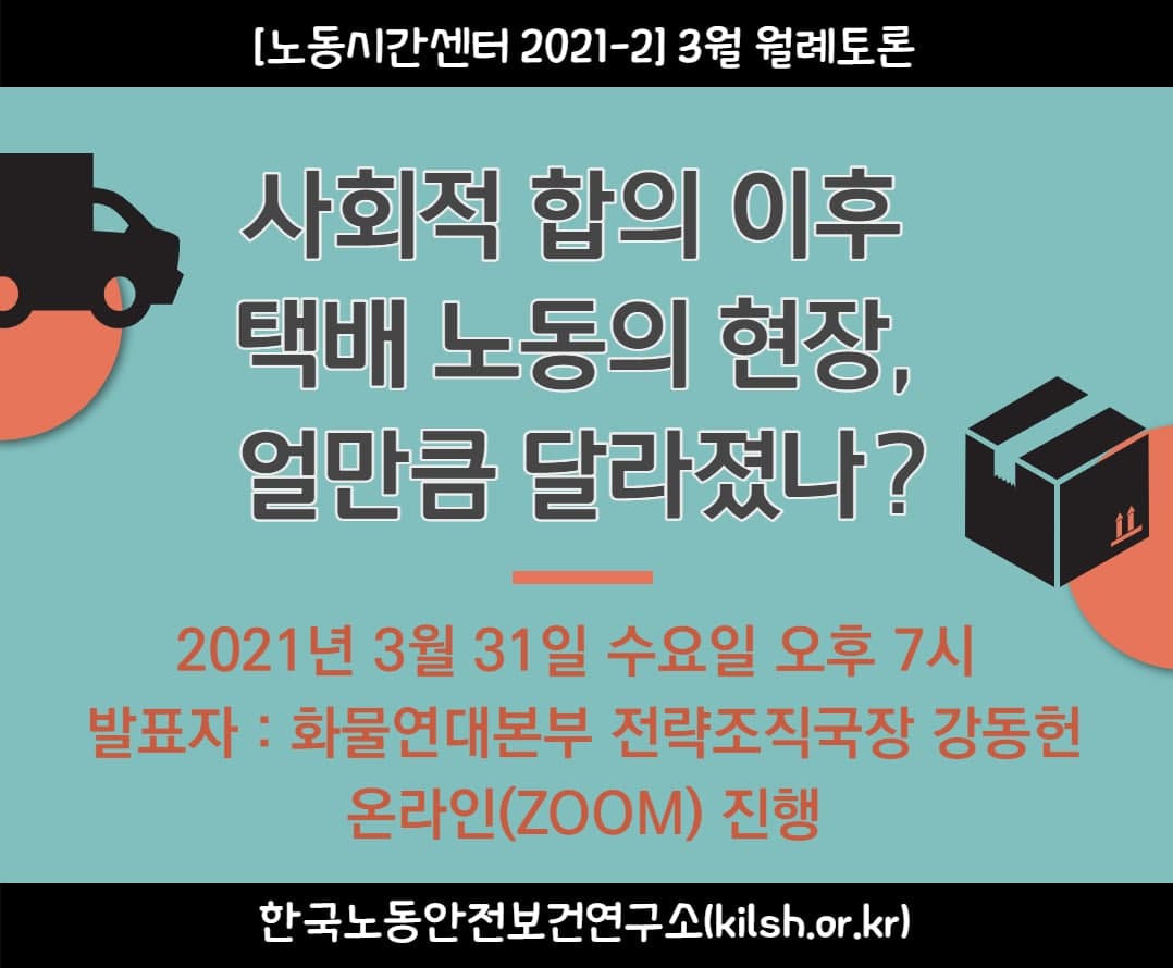 – 일시: 2021년 3월 31일 수요일 저녁7시 – 발표자: 화물연대본부 전략조직국장 강동헌 – 온라인(zoom)으로 진행 |