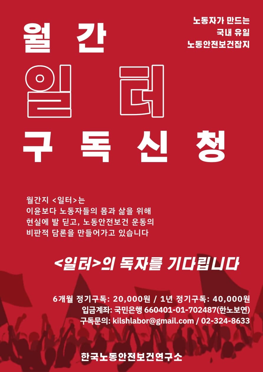 노동자가 만드는 국내 유일 노동안전보건 잡지 ‘일터’를 신청하세요! 노동조합, 단체, 기관 등 단체 신청도 환영합니다. |