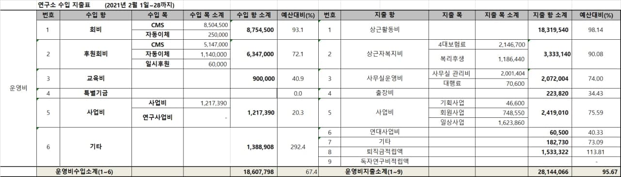 한국노동안전보건연구소 2월 살림표입니다. 2월에도 함께 해주신 분들이 계셔서 활동을 잘 해나갈 수 있었습니다. 다만, 연초인지라 교육 사업, 연구 사업 수입이 아직 많지 않은 이유도 있습니다만 연구소 상임활동가가 8명 규모에서 전국 단위로 활동하다 보니 지금의 회비, 후원회비 규모로 운영 호흡이 가빠지고 있습니다^^; 후원회비 증액, 일시 후원도 언제나 환영입니다. 연구소가 안정적으로 노동안전보건 활동을 해나갈 수 있도록 물심양면 함께 해주시길 바랍니다. 감사합니다! |