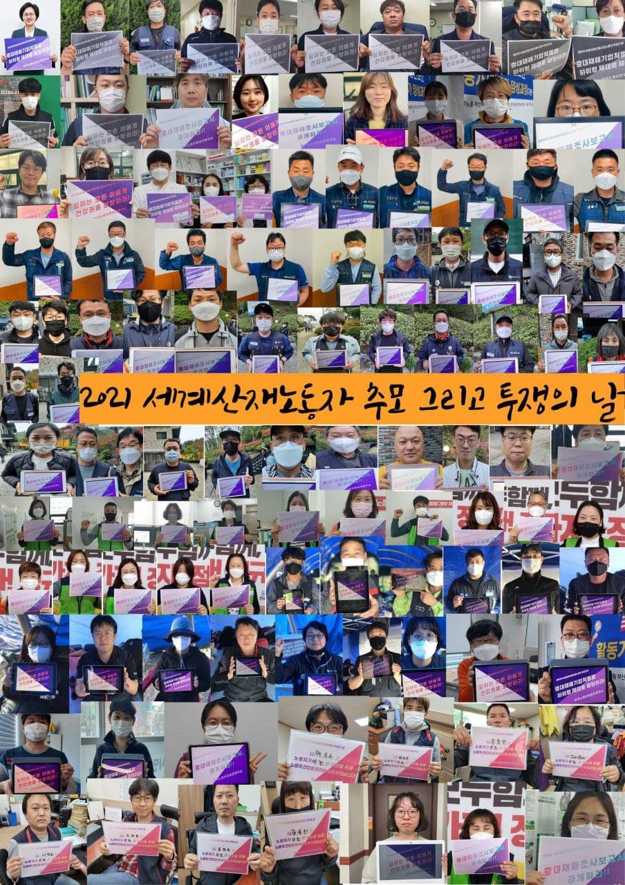 4월 28일은 세계 산재노동자 추모의 날입니다. 1993년 태국 장난감 공장 화재로 희생된 188명의 노동자를 기리기 위해 1996년 4월 28일 전 세계 노동조합 대표들이 촛불을 든 것을 시작으로 합니다. 추모를 시작으로, 노동자 건강권 쟁취를 위한 행동까지 이어져야 합니다. 이윤보다 노동자의 몸과 삶을, 더 안전하고, 더 건강하고, 더 편하게 일할 수 있는 노동자 건강권 쟁취를 위해 한국노동안전보건연구소와 함께 전국 곳곳의 많은 분들이 인증샷 공동행동을 진행했습니다. |