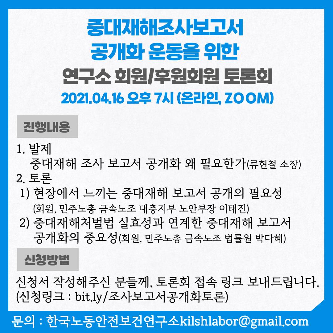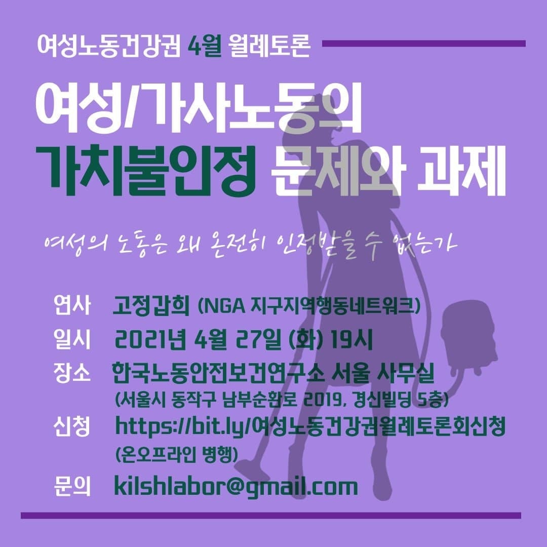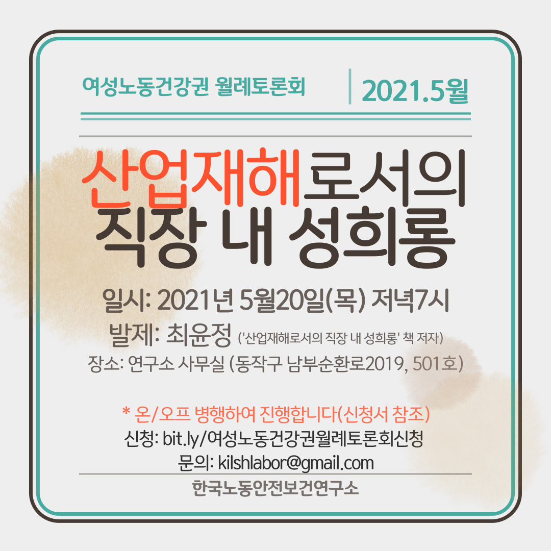 많은 관심과 참여 부탁드립니다. – 일시: 2021년 5월 20일 목요일 저녁7시 – 발제: 최윤정 (‘산업재해로서의 직장 내 성희롱’ 책 저자) – 장소: 연구소 사무실 (동작구 남부순환로2019, 501호) * 온라인(zoom)/사무실 병행하여 진행합니다. (신청서 참조) |