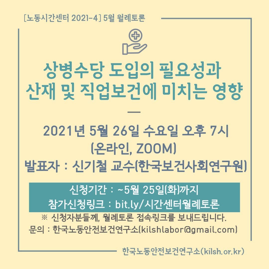 또한, 상병수당은 업무관련성 여부와 무관하게 지급되는 만큼 이제까지 일 하다 아픈 노동자들을 위한 유일한 보상체계였던 산재제도의 역할에도 영향을 줄 수 밖에 없는데요. 그래서 이번 노동시간센터 5월 월례회에서는, 상병수당의 필요성과, 산재제도&기업 보건체계에서 예상되는 변화들을 짚어보는 시간을 마련했습니다. 일시 : 2021.05.26 (수) 오후 7시 (온라인, ZOOM) 발표자 : 신기철 교수(한국보건사회연구원) * 신청하신 분들께 월례토론 접속하실 수 있는 링크를 보내드립니다. |