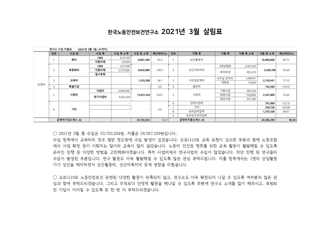 한국노동안전보건연구소 3월 살림표 모두의 덕분으로 3월 활동도 잘 해나갈 수 있었습니다. 감사드립니다. (자세한 내용 왼쪽 사진 참조) |