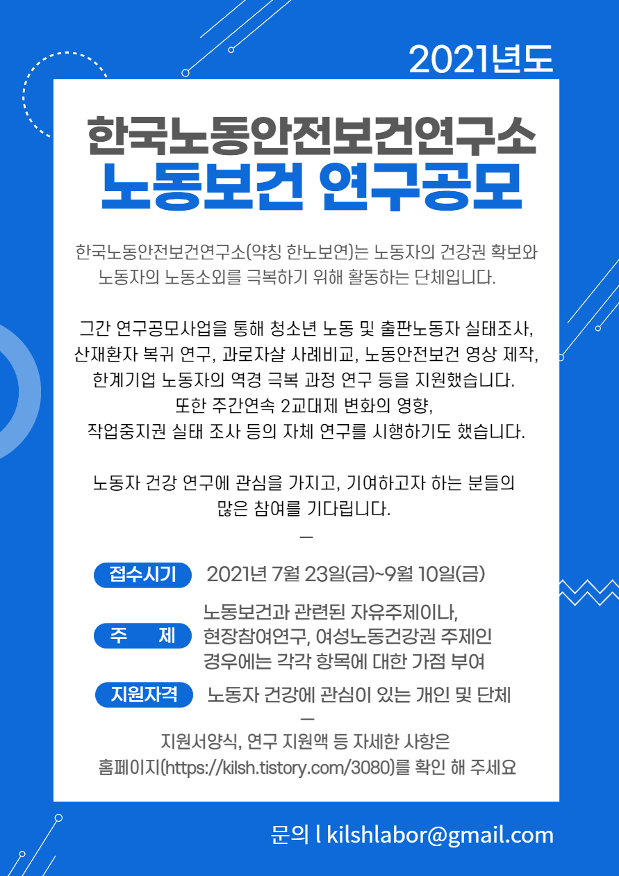 [안내] 한국노동안전보건연구소 노동 보건 연구 공모 서둘러주세요! |