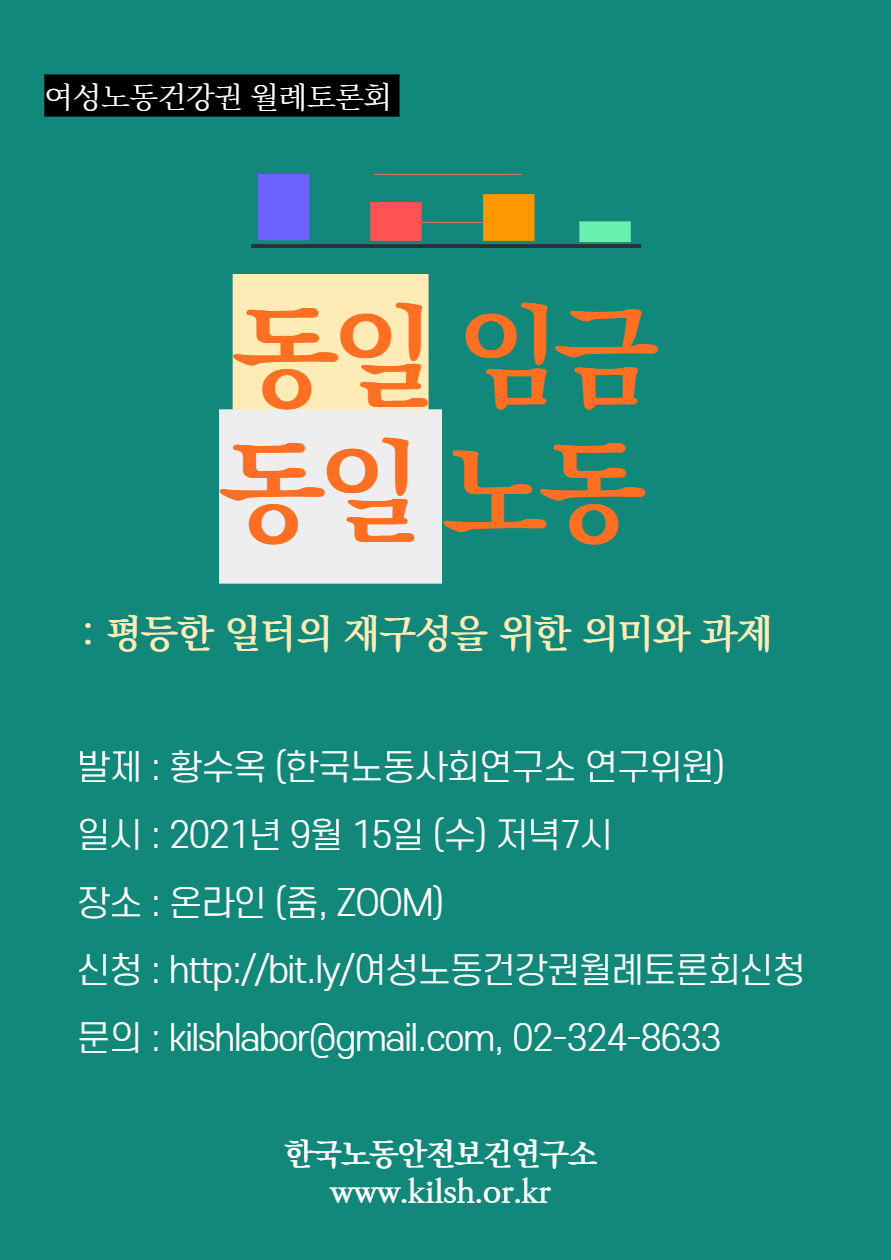 : 평등한 일터의 재구성을 위한 의미와 과제 여성노동자들이 평등한 일터와 권리 쟁취를 위해 요구했던 ‘동일노동 동일임금’은 혐오, 차별이 만연한 시대를 어떻게 관통할까요? 평등한 일터로 재구성하기 위한 것으로 어떤 의미와 과제를 남기는지 살펴보고자 합니다. 많은 관심과 참여 부탁드립니다. * 발제: 황수옥 (한국노동사회연구소 연구위원)