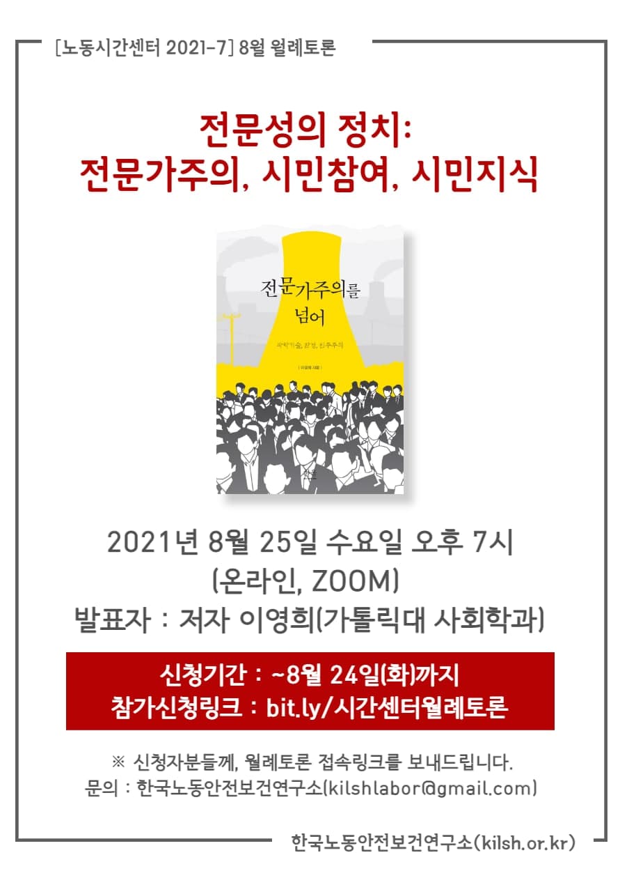 노동시간센터 8월 월례토론회는 ‘전문성의 정치: 전문가주의, 시민참여, 시민지식’이라는 주제로 가톨릭대 사회학과의 이영희 교수를 모시고 온라인으로 진행했습니다. 전문가들이 주도하는 의사결정에서 발생할 수 있는 문제들은 어떤 것들이 있고, 그것들을 넘어선 사례들에 대한 고민, 가능하게 하는 요소에는 어떤 것들이 있는지 나누는 시간이었습니다. |