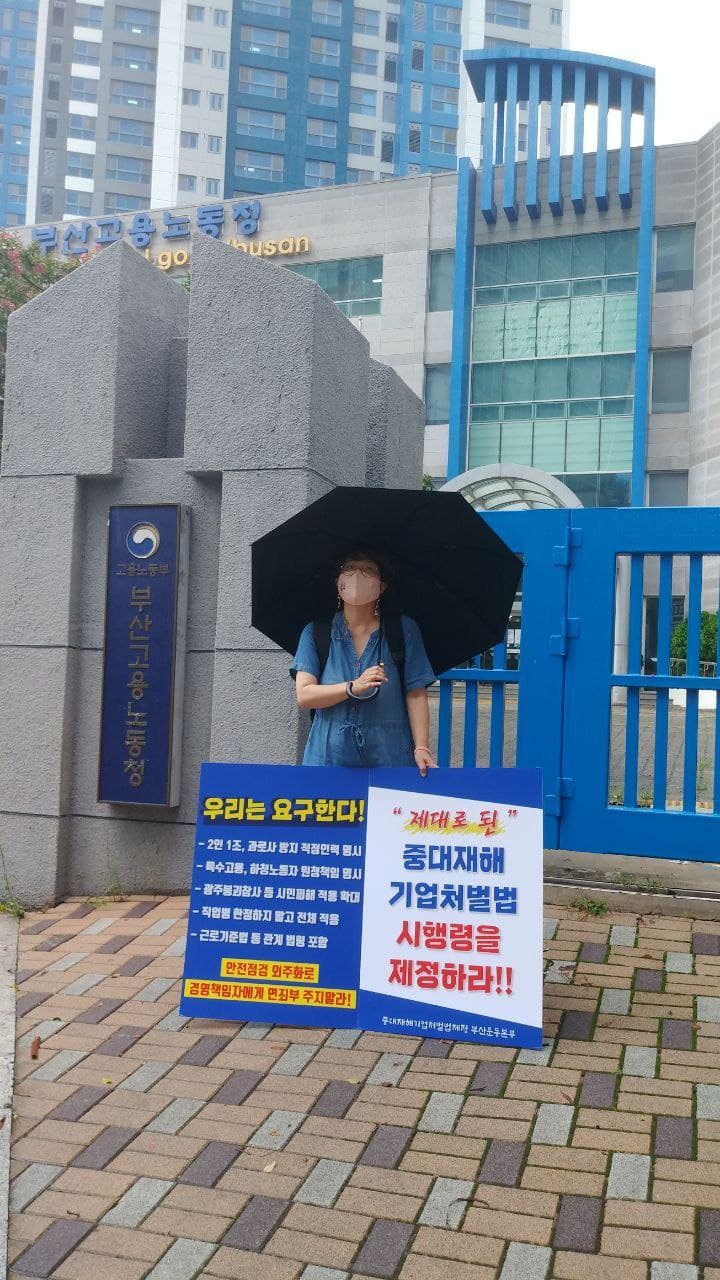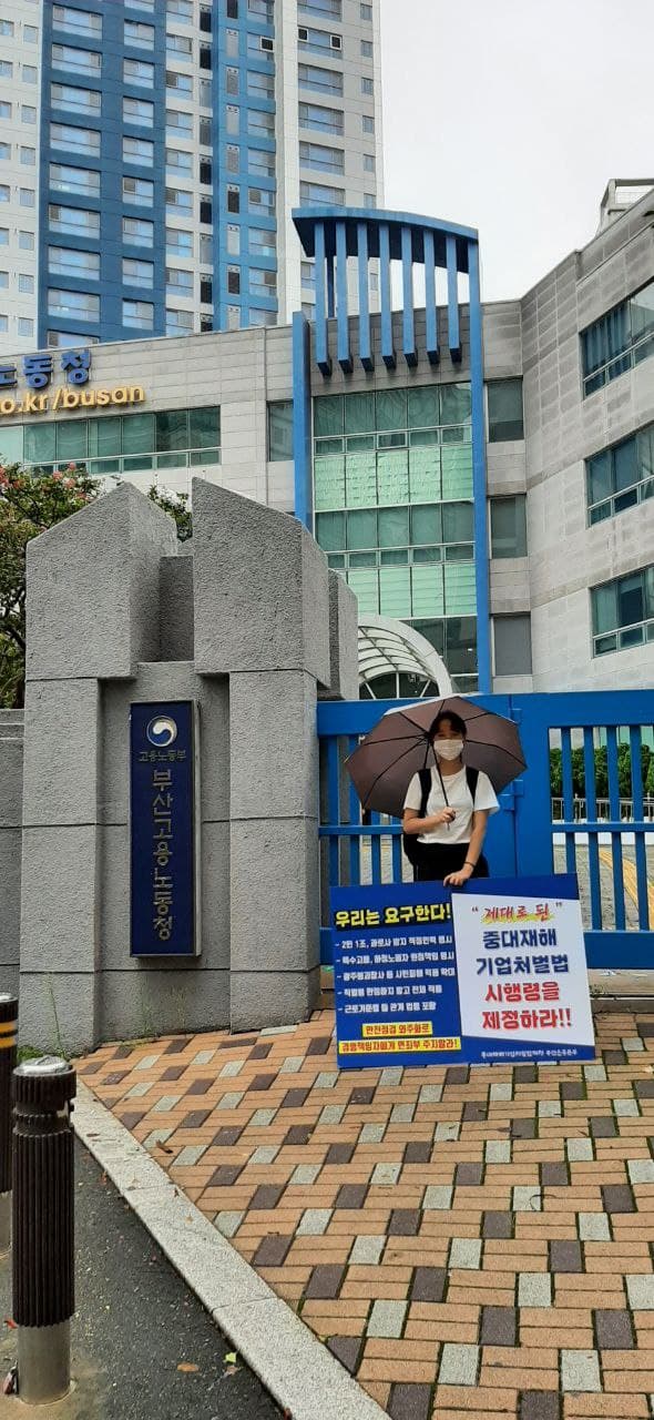중대재해기업처벌법이 올해 1월 어렵게 제정되었습니다. 하지만 끝이 아닙니다. 시행령 제정을 앞두고 협소한 직업성 질환 범위, 제외 대상이 많은 한계 등 여러 시민사회계의 의견들이 계속 제기되고 있습니다. 전국 곳곳에서도 시행령을 제대로 제정하길 요구하는 행동들이 이어졌습니다. (사진: 부산 상임활동가들의 1인 시위 활동) |