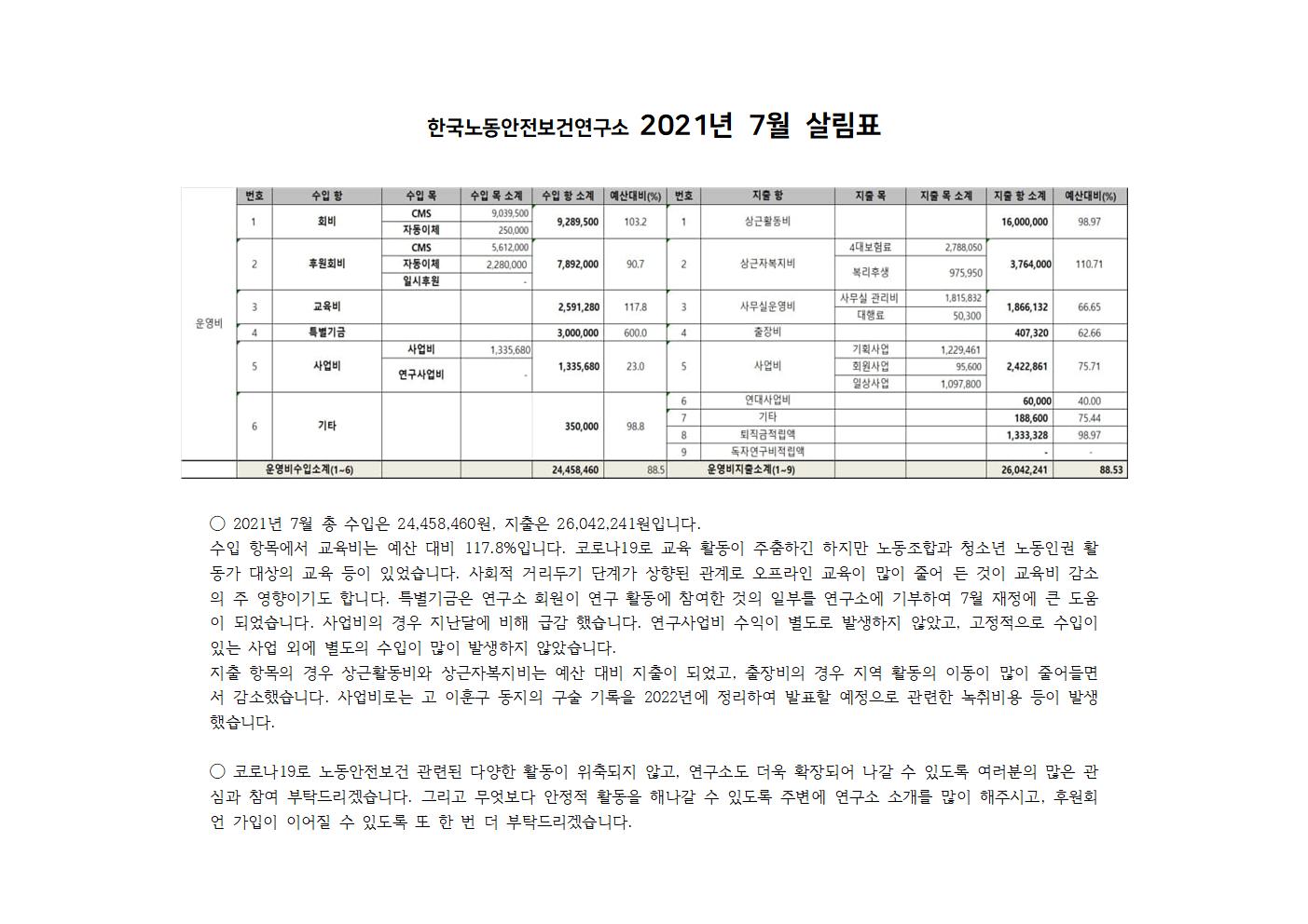한국노동안전보건연구소 7월 살림표 모두의 덕분으로 7월 활동도 잘 해나갈 수 있었습니다. 감사드립니다. (자세한 내용 왼쪽 사진 참조) |