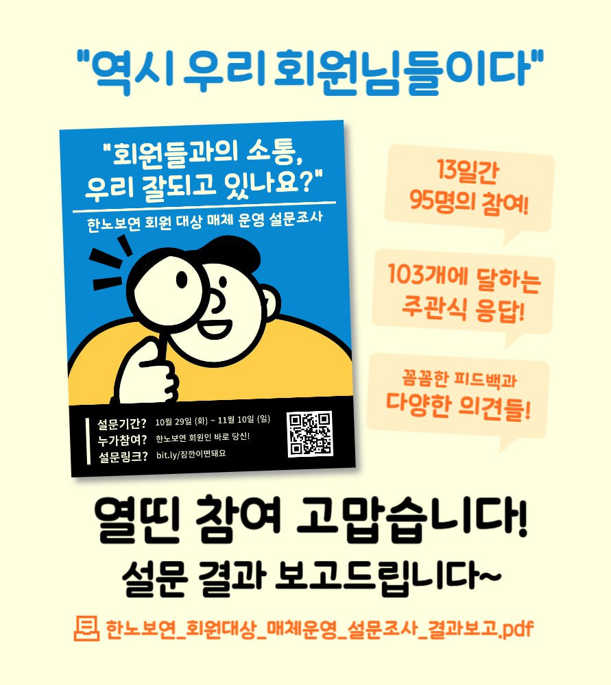 [매체팀] 연구소 매체 운영 회원 설문조사 결과 활동소식 🙌 지난 10월 29일부터 11월 10일까지 연구소 매체모색팀에서 진행한 ‘한노보연 회원대상 매체운영 설문조사 결과’를 공유합니다. 무려 95명이나 되는 회원이 함께해주셨고, 103개에 달하는 연구소 매체 운영에 대한 많은 의견을 주셨습니다. 함께해주신 회원분들께 감사 인사 드립니다. 🙏 ✍️ 연구소 매체 운영 회원 설문조사 결과는 아래 링크로 들어가면 확인할 수 있습니다. https://url.kr/s1nlaw ♥192024년 12월 16일2025년 02월 26일활동소식매체운영메체운영연구소매체팀연구소채널텔레그램한노보연