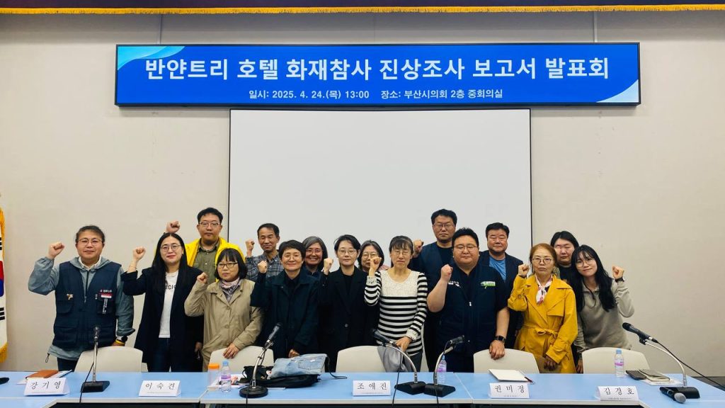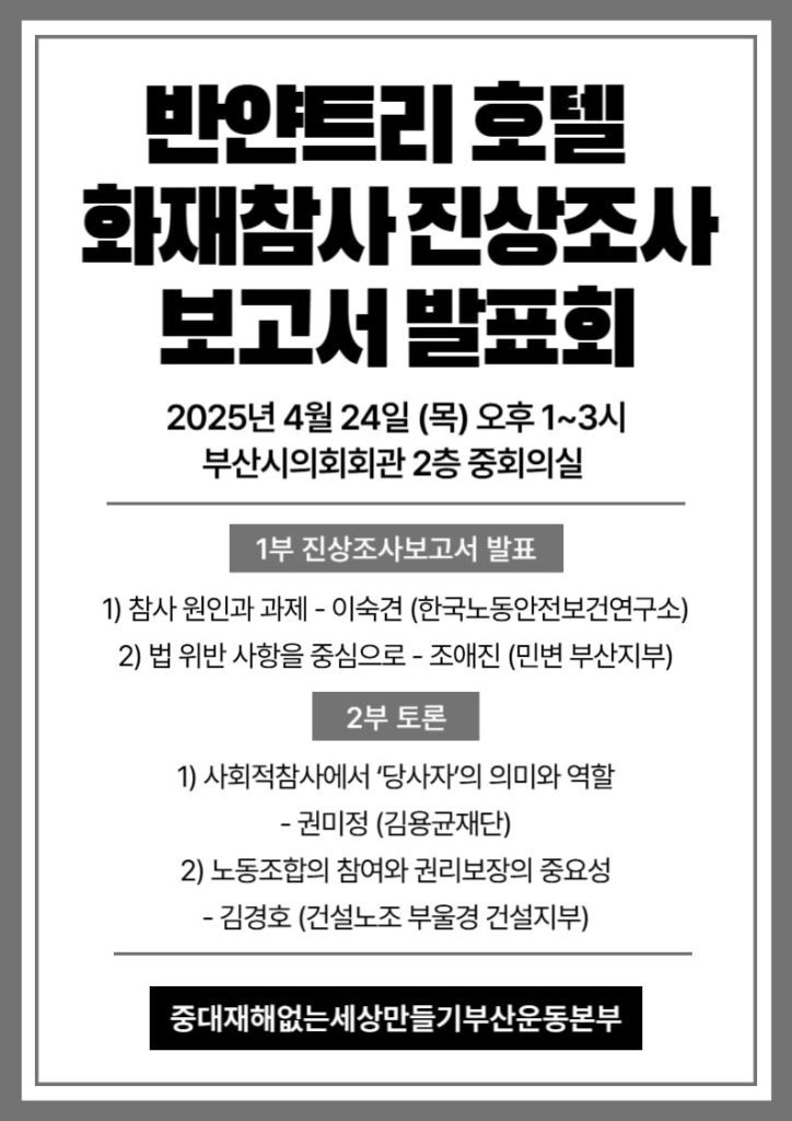 4월 24일 13시 부산지역에서는 중대재해없는세상만들기부산운동본부와 함께 반얀트리 호텔 화재참사 진상조사 1차 보고서 발표회를 진행하였습니다.