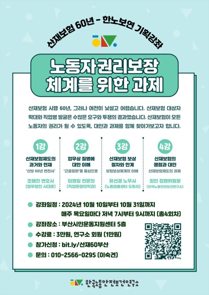 10월 10일(목)부터 10월 31일까지 매주 목요일, 4주동안 진행하는 부산 산재보험 기획강좌에 함께 해주십시오.
