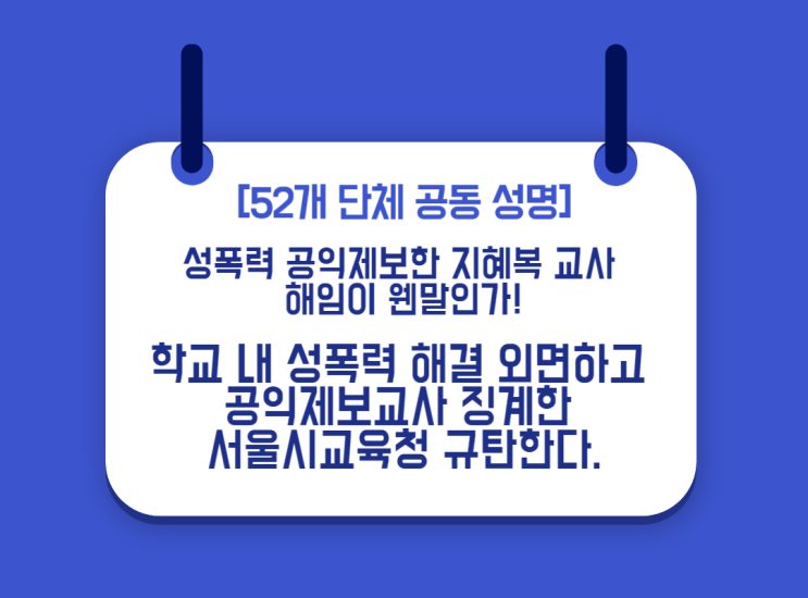 성폭력 피해학생 곁에 선 교사를 쫓아내고 해임함으로써, 교육당국은 성폭력 피해학생들의 침묵과 교육노동자의 굴종을 강요하고 있다. 그러나 징계가 두려웠다면 시작하지도 않았을 투쟁이다.