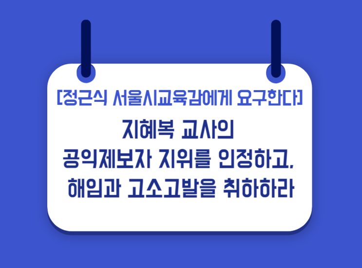다섯째, 서울시교육청은 ‘횡령이나 배임을 제보한 것이 아니니 공익제보라고 볼 수 없다’는 파렴치한 법리조작으로 지혜복 교사의 공익제보자 지위를 부인하며 부당전보를 정당화했고, 끝내 문제 시정을 요구하는 지혜복 교사를 해임하고 형사고발까지 자행했다.