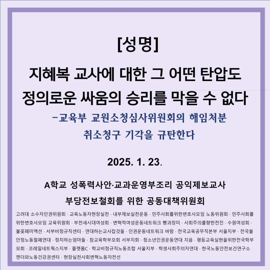2025년 1월 23일, 교육부 교원소청심사위원회가 지혜복 교사의 해임처분 취소청구 ‘기각’을 알려왔다. 학내 성폭력 축소·은폐와 2차가해에 문제제기하고, 피해학생들을 보호하고자 노력하다 학교에서 쫓겨난 지혜복 교사에게, 심지어 그 자신이 2차가해 대상이 된 지혜복 교사에게, 교육당국은 끝없는 행정폭력을 자행하고 있다. 지혜복 교사와 공대위는 부당해임을 정당화한 교육부의 결정을 강력히 규탄하며, 굽히지 않고 싸울 것이다.