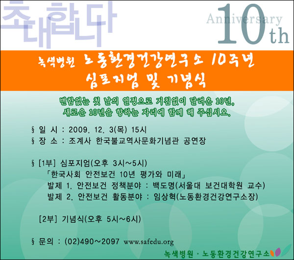 [노동환경건강연구소10주년]심포지엄 및 기념식에 초대합니다. 일과건강 날짜작성일 : 2009-11-16 11:41 원진레이온 직업병 투쟁의 소중한 결실로 1999년 6월 문을 연 노동환경건강연구소가 올해 10주년이 되었습니다. 연구소와 연을 맺은 많은 분들을 모시고 기념식을 갖고자 합니다. 바쁘시더라도 자리하시면 더없는 기쁨이 될 것 입니다. ○ 노동환경건강연구소 10주년 심포지엄 및 기념식 - 일 시 : 2009년 12월 3일(목) 오후3시 - 장 소 : 조계사 한국불교역사문화기념관 공연장 - 문 의 : 02)490~2097 2009-11-16 11:41 일과건강
