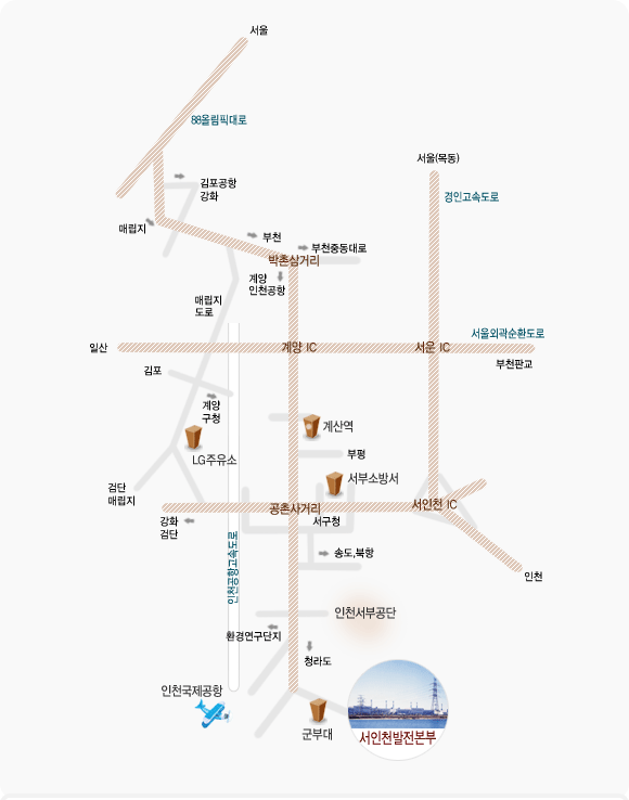 경인고속도로로 오시는 분은 서인천IC로 나와서 계속 직진 - 공촌사거리에서 좌회전 - 인천공항고속도로 방향으로 계속 직진 - 톨게이트 들어가전 좌측 청라도 방향으로 직진 - 좌측에 발전소가 보입니다.)