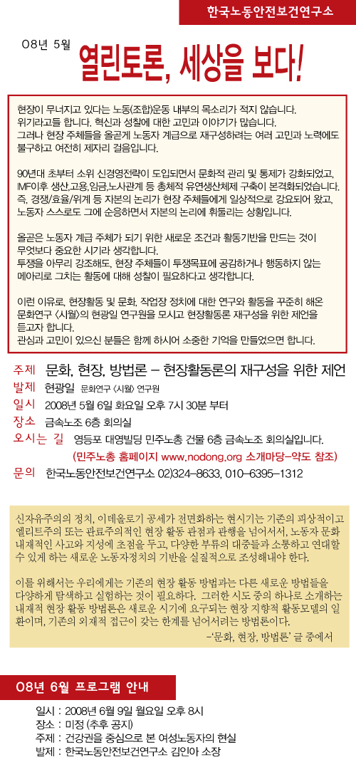 한노보연 5월 열린토론에 동지들을 초대합니다