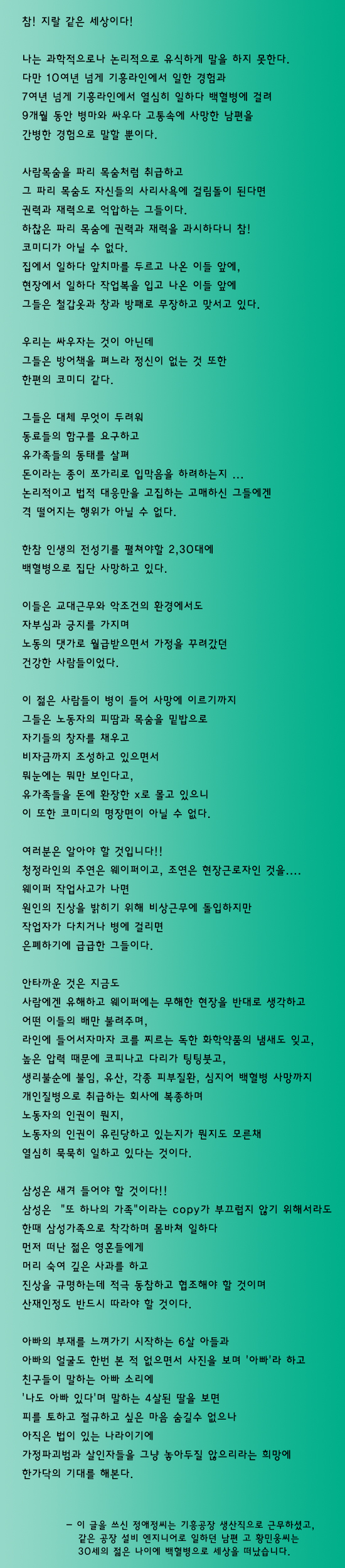삼성반도체 노동자에게 드리는 글 반올림 날짜작성일 : 2008-04-28 11:08 이 글은 지난 4월 25일 삼성반도체 기흥공장 앞에서 정애정씨가 낭독한 것입니다. 2008-04-28 11:08 반올림