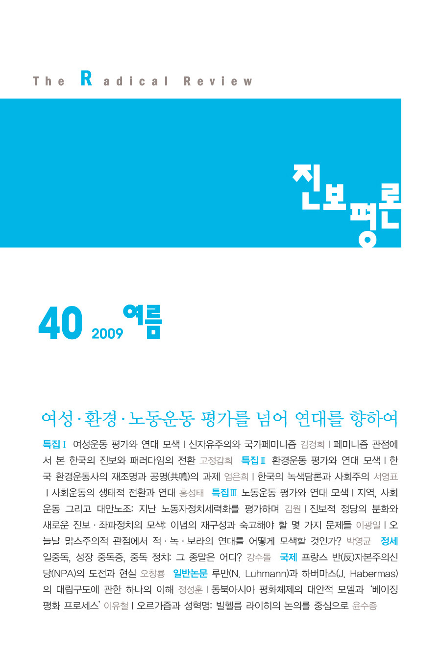 진보평론 40호는 특집으로 적·녹·보라의 자체 평가에 기반한 연대를 기획하였다. 이 기획은 과거 10년 간 진행되어 온 고립을 벗어나 연대를 모색하기 위한 첫걸음으로서의 의미를 가지고 있다.