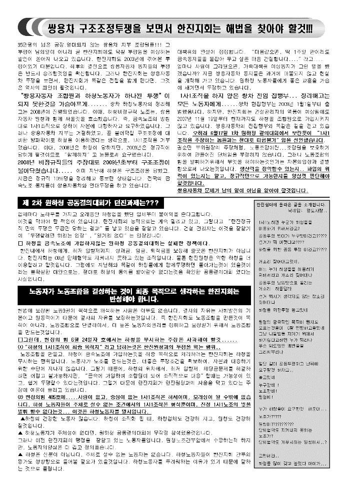 1사1조직을 하지 않은 쌍용차 전임 집행부... 정리해고는 모든 노동자에게...... 쌍용차 현집행부는 2009년 1월1일부터 출범했음니다. 하지만, 한진지회는 건설관리자의 역풍이 예상됨에도 2007년 11월 19일부터 현재까지도 하청을 조합원으로 가입시키지 않고 있습니다. 쌍용자동차의 전집행부와 똑같은 길을 걷고 있습니다. 오히려 6월17일 1차 원하청 결의대회에서 보란듯이 “1사1조직을 주장하는 놈들과는 절대로 타협불가”임을 선언했습니다.