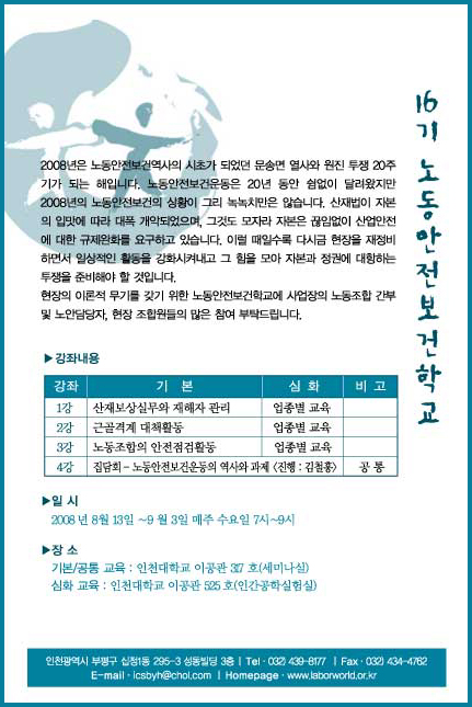 녹록치 않은 현실속에서 어느덧 건강한노동세상이 제16기 노동안전보건학교를 진행하게 되었습니다. 많은 투쟁현안과 일정으로 시간을 내기가 쉽지는 않겠지만 노동자 건강권을 지켜내기 위해 함께 고민하는 시간을 가졌으면 좋겠습니다.