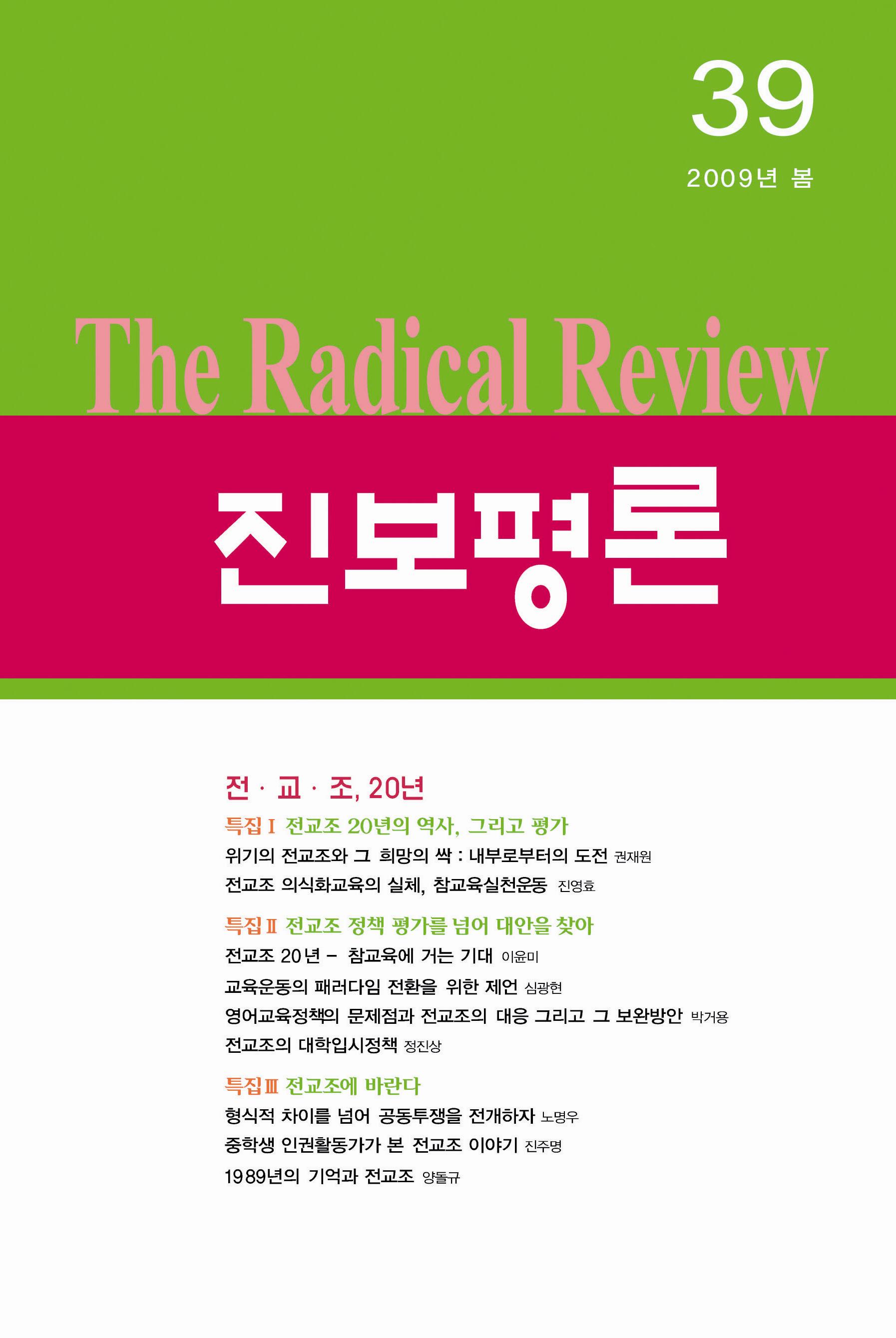 이번 진보평론 39호의 특집은 전교조로 잡았다. 특집 주제를 전교조로 잡은 것은 전교조 결성 20주년이라는 점도 있지만, 무엇보다도 보수우파세력의 ‘전교조 죽이기’에 맞서 사회진보세력과 연대하여 전교조가 어떤 식으로 싸워나갈 수 있는지 그 길을 찾아보려는 데에 있다. ‘전교조’는 80년대 한국사회의 민주화 과정 속에서 결성된 여러 사회조직 가운데 가장 큰 상징성이 부여된 조직이다. 그렇기 때문에 전교조에 거는 기대는 다른 조직에 비해 더 크다. 또한 온갖 파행과 왜곡으로 찌들어있는 교육을 바로 잡기를 바라기 때문에 국민이 전교조에 거는 기대와 열망은 남다르다. 그래서 푸념과 비난을 하고만 있을 수는 없다. 우리는 어떻게든 전교조를 살려야 한다. 무엇보다도 전교조 스스로가 분골쇄신하는 마음으로 온 국민이 바라는 그런 참교육 전교조로 거듭나기 위해 혼신의 노력을 경주해야 한다.