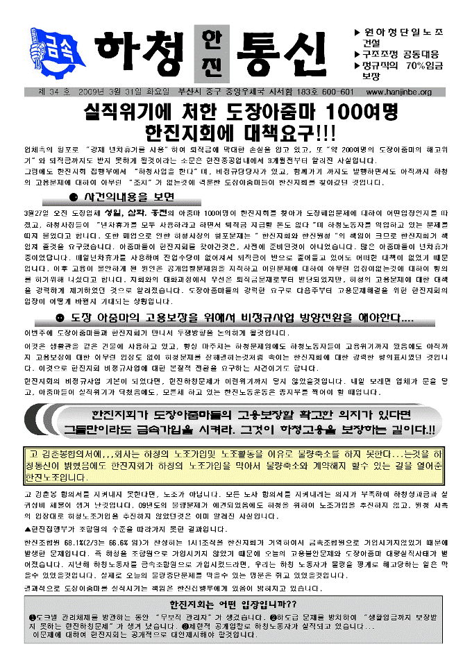 3월27일 오전 도장업체 성일, 삼화. 홍천의 아줌마 100여명이 한진지회를 찾아가 도장폐업문제에 대하여 어떤입장인지를 따졌고, 하청사장들이 “년차휴가를 모두 사용하라고 하면서 퇴직금 지급할 돈도 없다“며 하청노동자를 억압하고 있는 문제를 따져 물었다고 합니다. 또한 폐업으로 인한 하청사장의 횡포문제는 ”한진지회와 한진원청“의 책임이 크므로 한진지회가 책임져 줄것을 요구했습니다. 아줌마들이 한진지회를 찾아간것은, 사전에 준비된것이 아니었습니다. 많은 아줌마들이 년차휴가중이었답니다. 매일년차휴가를 사용하여 잔업수당이 없어져서 퇴직금이 반으로 줄어들고 있어도 어떠한 대책이 없었기 때문입니다. 이후 고용이 불안하게 된 원인은 공개입찰문제임을 지적하고 이런문제에 대하여 아무런 입장이없는것에 대하여 항의를 하기위해 나섰다고 합니다. 지회와의 대화과정에서 우선은 퇴직금문제로부터 발단되었지만, 하청의 고용문제에 대한 대책을 강력하게 제기하였던 것으로 알려졌습니다. 도장아줌마들의 강력한 요구로 다음주부터 고용문제해결을 위한 한진지회의 입장이 어떻게 바뀔지 기대되는 상황입니다.