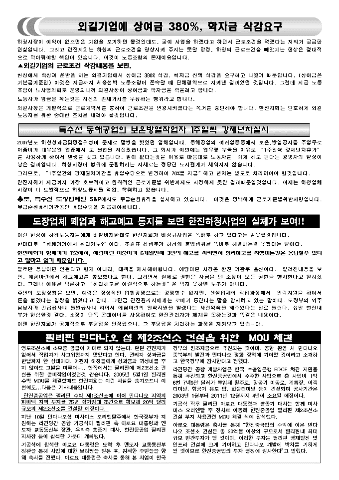 업체측의 횡포로 “강제 년차휴가를 사용”하여 퇴직금에 막대한 손실을 입고 있고, 또“약 200여명의 도장아줌마의 해고위기”와 퇴직금까지도 받지 못하게 될것이라는 소문은 한진중공업내에서 3개월전부터 알려진 사실입니다.