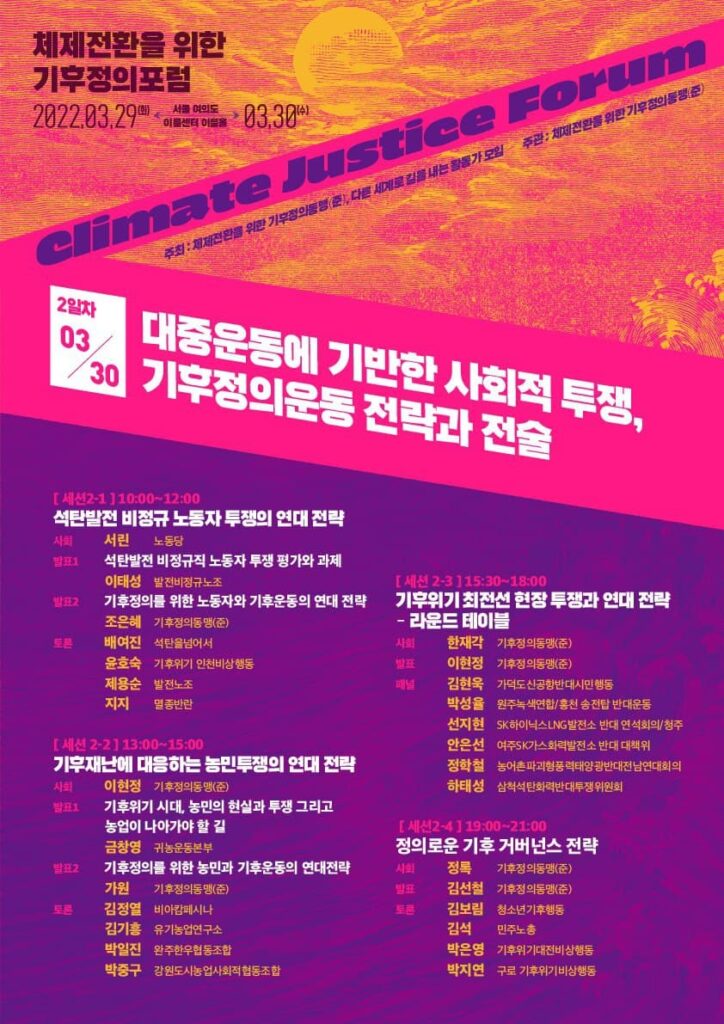 2022년 3월 29일~30일, 체제전환의 전망과 대안이라는 기후정의운동의 밑그림을 함께 그리는 자리가 열립니다. 자본 주도의 기후위기 대응에 대한 반대와 비판에서 한 발 더 나아가, 체제전환의 전망과 대안이라는 공동의 토대 위에서 우리의 투쟁과 요구들을 조직하고 쌓아가고자 합니다. 사회적 투쟁이자 대중운동으로서 기후정의운동의 전략과 전술을 고민하는 분들과 함께 하고 싶습니다. 많은 관심과 참여 부탁드립니다.