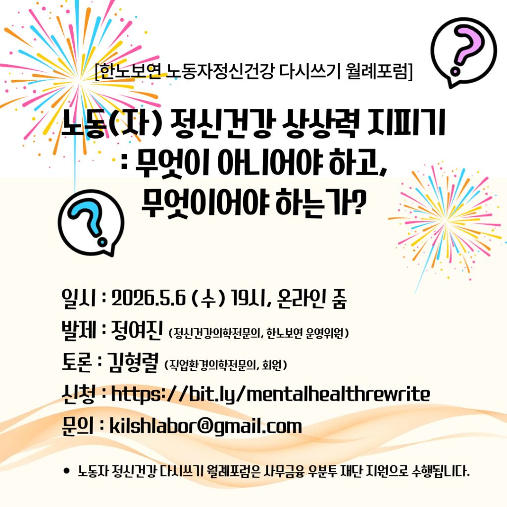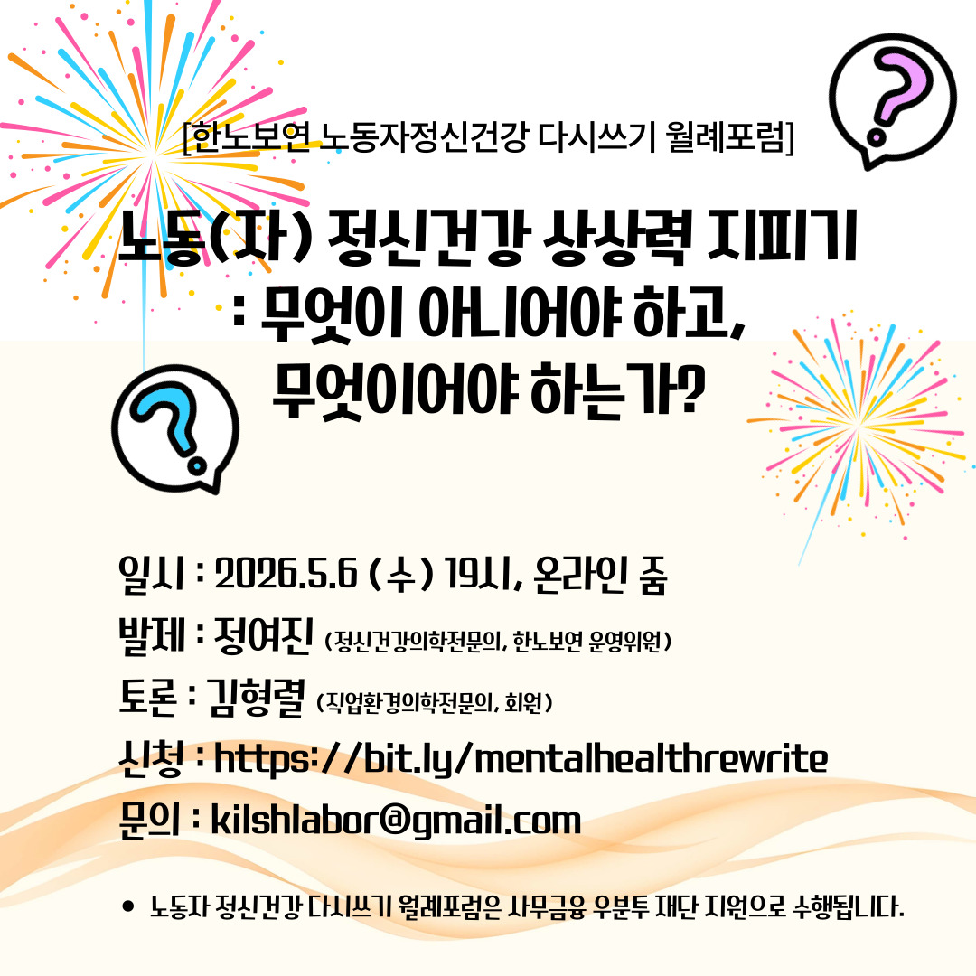 노동자 정신건강 문제에 천착해온 한노보연 여러 회원들과 함께, 노동자 정신건강 이야기를 다시 써내려가 보려고 합니다. 관심있는 분들 누구나 환영합니다!