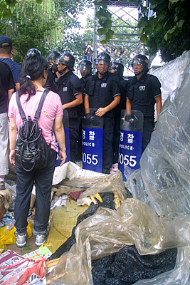 31회 피플파워 <사진으로 보는 세상>이 농성장의 풍경을 다룰 예정이어서 미리 하이텍 농성장의 풍경을 찍어 두었다. 힘겨운 투쟁을 해야 하는 좁고 더운, 비가 오면 걱정인, 그러나 노동자들의 또 하나의 삶의 공간인 농성장은 일종의 희망의 공간이고 투쟁의 거점이었다. 그러니 방용석 이사장은 얼마나 저 농성장을 짓밟아 버리고 싶었겠는가?