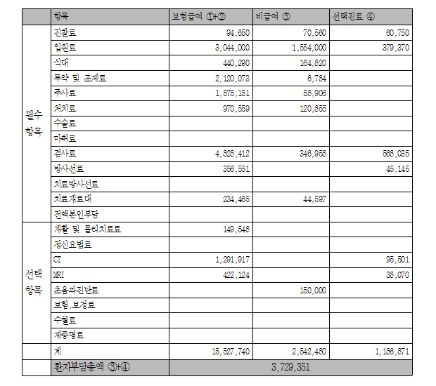 위의 표는 09년 2월 00일 ~ 4월 00일까지 서울대병원에 입원한 의료급여 1종 환자의 진료비 명세표입니다. 의료급여 1종 환자임에도 비급여와 선택진료비로 인해 두어 달 병원비로 3,729,351원을 납부해야 합니다. 환자부담 총액중 선택진료비 비중은 31%나 차지하고 있습니다.