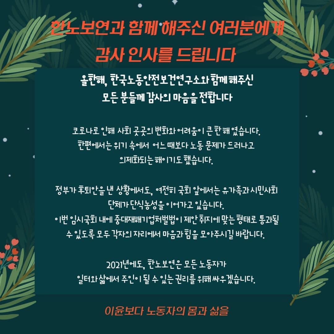 기부금 영수증 관련하여 별도의 문의내역이 있으신 분은 kilshlabor@gmail.com으로 문의주시거나, 02-324-8633으로 연락주시기 바랍니다. 12월 코로나19로 재택근무 중인지라, 서울사무실의 경우 순환근무하고 있으니 가능하면 메일로 문의, 요청사항 및 연락처를 알려주시면 담당자가 연락 드리도록 하겠습니다.더불어 기존 회비, 후원회비를 납부하시는 분들 중 cms로 납부방식을 변경하실 분들이 계시다면, 연락주세요. 감사합니다.