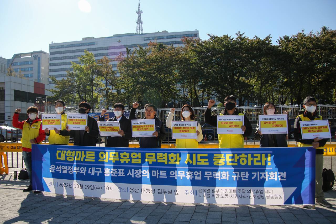 10월 19일 용산 대통령실 앞에서 마트 의무휴업을 평일로 옮기려는 대구시와 국무조정실을 규탄하는 기자회견을 서비스연맹 및 의무휴업 폐지 저지를 위한 공동행동 주관으로 진행하였습니다. 연구소도 주말의무휴업, 노동자건강권을 주제로 연대발언 진행하였습니다. |