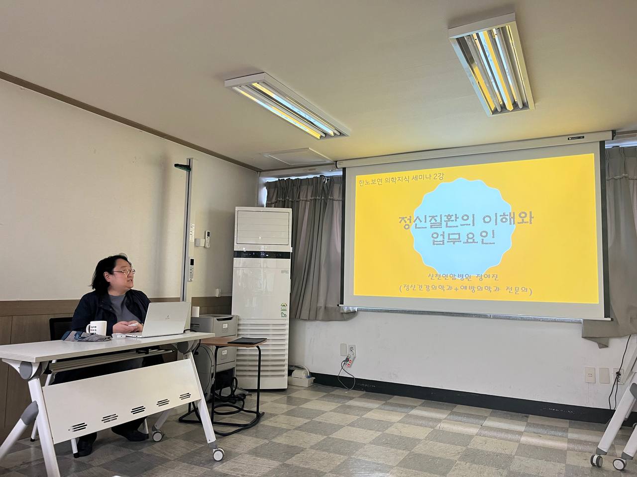서울, 충청권에 이어 지난 10월 22일과 29일 2주에 걸쳐 부산지역 회원, 후원회원 대상으로 의학지식 세미나가있었습니다. 1강은 근골격계질환에 대해 류현철 소장, 2강은 정신질환에 대해 정여진 회원이 교육을 맡아주셨습니다. 부산 사무실 강의실이 꽉 찰 정도로 많은 분들이 참여해주셨습니다. 이후에도 지역에서 필요로 하는 활동으로 이어나가겠습니다.