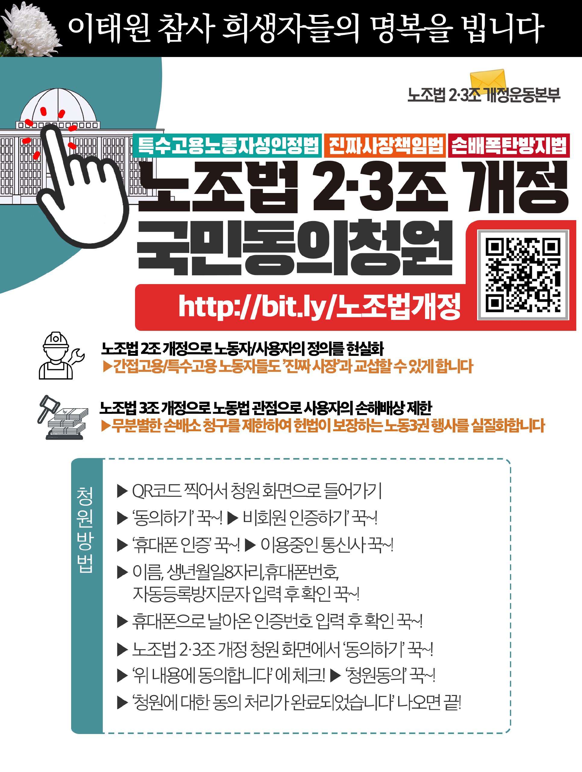 노동자를 살리는 법, 노동조합을 지키는 법, 노조법 2.3조 개정 청원운동이 시작되었습니다!