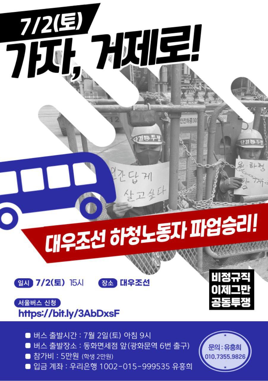 7/2(토) 거제 대우조선 투쟁에 함께하는 마음을 모아 버스배치를 마련했습니다.