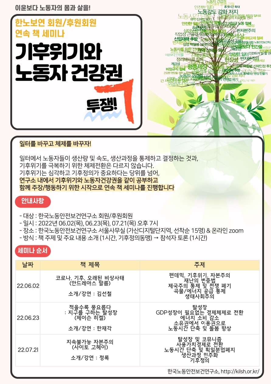 기후위기는 심각하고 기후정의가 중요하다는 당위를 넘어, 연구소 내에서 기후위기와 노동자건강권을 같이 공부하고 함께 주장/행동하기 위한 시작으로 연속 책 세미나를 진행하고 있습니다.