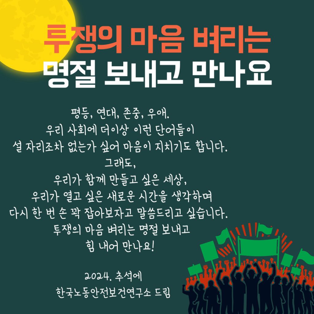 [2024 추석인사] 투쟁의 마음 벼리는 명절 보내고 만나요 공지사항 <투쟁의 마음 벼리는 명절 보내고 만나요> 평등, 연대, 존중, 우애. 우리 사회에 더이상 이런 단어들이 설 자리조차 없는가 싶어 마음이 지치기도 합니다. 그래도, 우리가 함께 만들고 싶은 세상, 우리가 열고 싶은 새로운 시간을 생각하며 다시 한 번 손 꽉 잡아보자고 말씀드리고 싶습니다. 투쟁의 마음 벼리는 명절 보내고 힘 내어 만나요! 한국노동안전보건연구소 드림 ♥552024년 09월 13일2024년 09월 27일공지사항마음명절인사추석투쟁