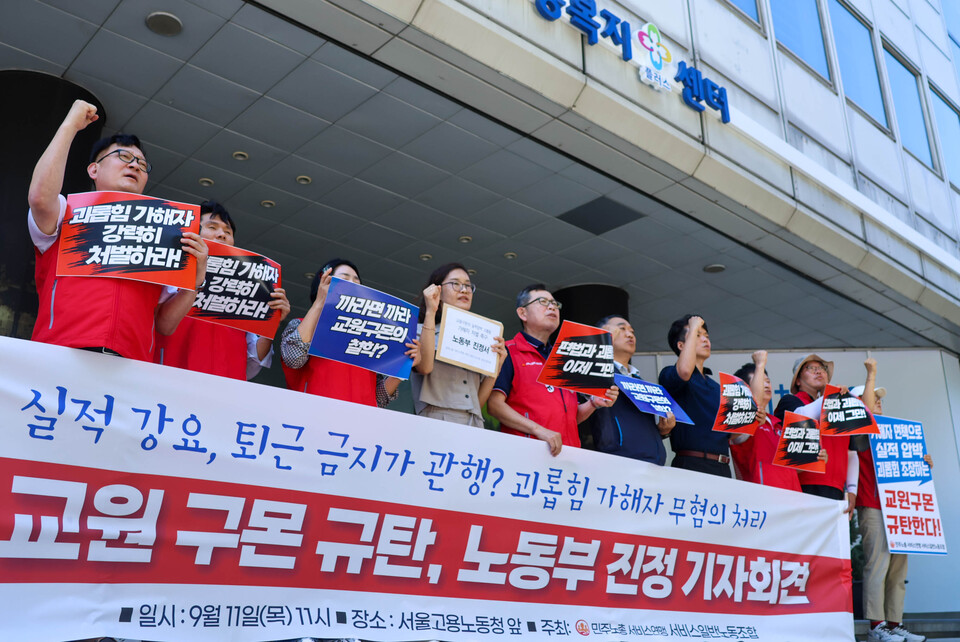 ▲2025.09.11. 직장내괴롭힘 사건의 가해자 무혐의 처리에 대한 사측 규탄 및 노동부 진정 기자회견이 서울고용노동청 앞에서 서비스연맹 서비스일반노동조합 주최로 열렸다. ⓒ 노동과세계
