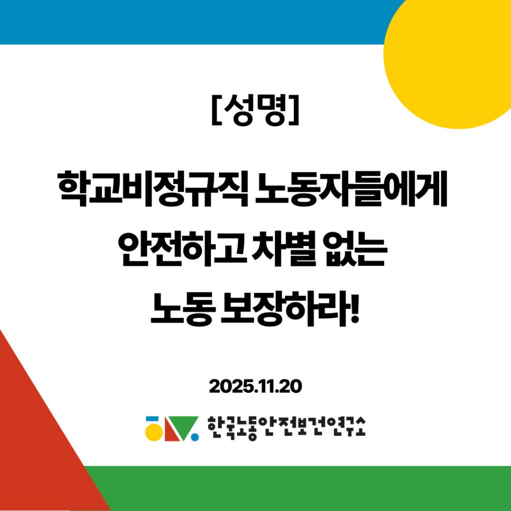 우리 한국노동안전보건연구소는 학교비정규직연대회의의 파업을 지지한다. 학교비정규직 노동자들이 교섭요구를 마침내 쟁취하고, 차별 없는 학교에서 안전하게 일할 때까지 우리는 함께할 것이다.