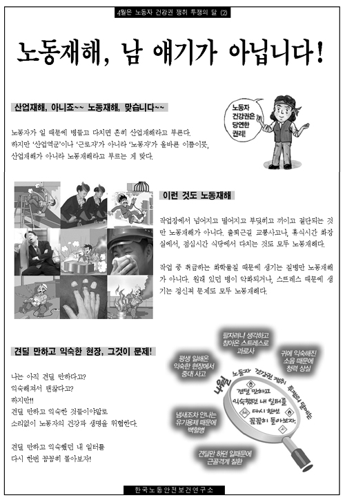 한국노동안전보건연구소에서는 4월 노동자 건강권 쟁취 투쟁의 달을 맞아 현장선전에 활용할 수 있는 소자보를 만들었습니다.
